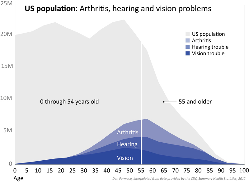 The Center for Disease Control in the US periodically publishes updates on health statistics. Here is a chart showing age distribution of three common problems – arthritis, hearing trouble and vision trouble (even after corrective eyewear).